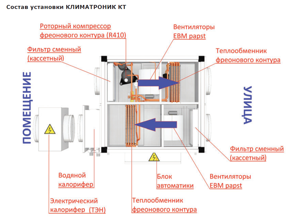 Профессиональные вентиляционно-осушительные машины делают свою работу не за счет конденсации воды на фреоновом теплообменнике осушителя, а за счет подачи в обслуживаемое помещение подготовленного, подогретого уличного воздуха с более низким влагосодержанием . Степень совершенства таких машин определяется не количеством литров полученного конденсата, а количеством энергии (тепловой и электрической), затраченной на подогрев приточного воздуха до требуемой температуры, как летом, так и в зимнее время. Это главный критерий энергоэффективности вентиляционно-осушительной установки и стоимости ее эксплуатации. Используемые во многих машинах пластинчатые рекуператоры позволяют перенести часть тепла вытяжного воздуха в нагрев холодного приточного воздуха , но температурный КПД используемых перекрестных пластинчатых рекуператоров не превышает 50-60% , поэтому, после прохождения рекуператора приточный воздух следует догревать еще на 15-18 градусов. Именно для этого догрева на 15-18 градусов и используются фреоновые тепловые насосы. Они обладают очень важной энергосберегающей функцией - потребляют в несколько раз меньше электроэнергии , чем количество переносимого из вытяжки тепла. Как мы выяснили, тепло горячей воды стоит в 3-7 раз дешевле, чем тепло от электричества, поэтому такой способ догрева часто не приносит никакой выгоды пользователю. Машины с инверторными тепловыми насосами позволяют развивать переменную тепловую мощность, у них высокий КПД работы и чрезвычайно низкие затраты тепла на догрев приточного воздуха до требуемой температуры. Энергетическое ядро таких установок - это не примитивный перекрестный пластинчатый рекуператор с температурным КПД не превышающим 50-60%, а высокоэффективный противоточный пластинчатый рекуператор с КПД, достигающим 96%, который позволяет намного эффективнее использовать тепловую энергию вытяжного воздуха. К таким машинам относятся установки нашей компании «КТ-СПЕКТР-АКВА 9000В".